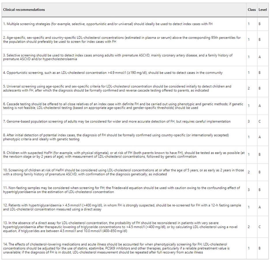 New guidance from this society asserts that “Early detection of FH is fundamental to all models of care for FH. … However, the best approach to detecting FH in primary care remains uncertain.” Nonetheless, they offer the following recommendations for the screening of FH: