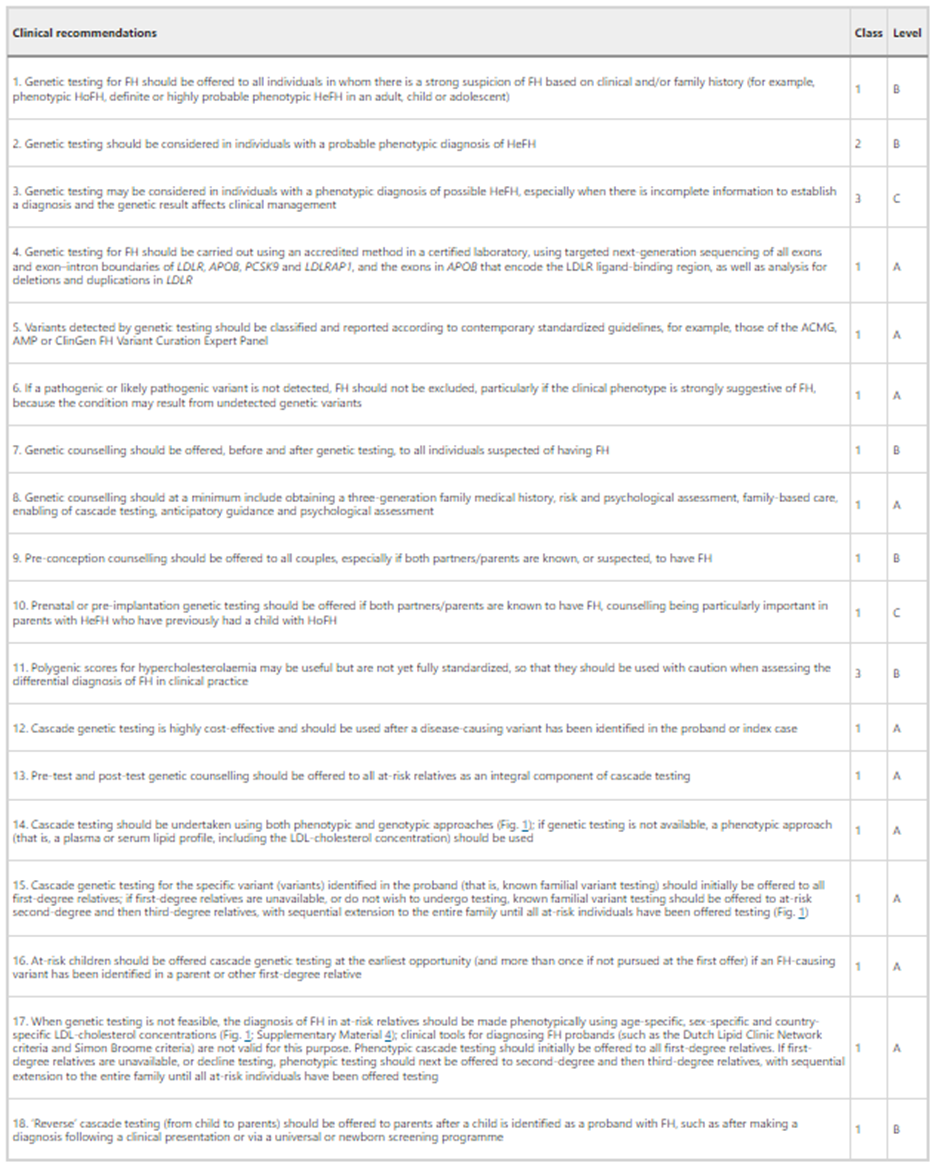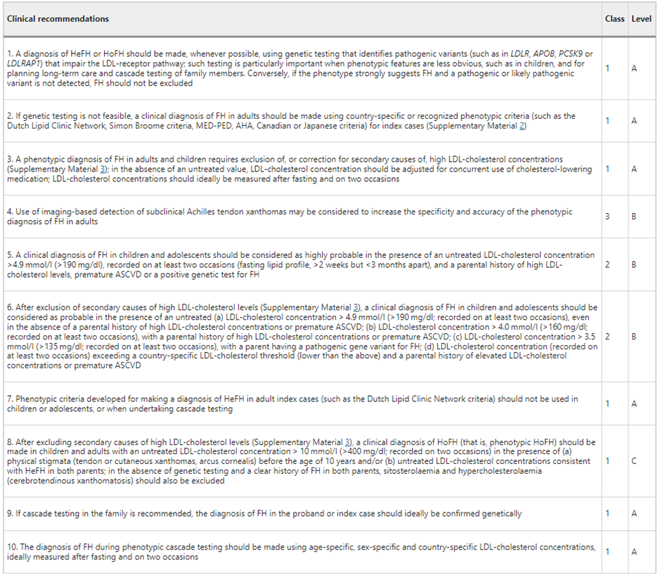 The Task Force for the management of dyslipidaemias of the European Society of Cardiology (ESC) and European Atherosclerosis Society (EAS) published an update in 2019. In it, they recommend that genetic testing should be performed to confirm clinically suspicious cases of FH. The EAS lists the following criteria as evidence for FH: